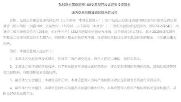如弘毅远方基金就发布风险提示,弘毅远方国证消费100ETF二级市交易价格连续波动, 2月24日二级市场收盘价为1.295元,相对于当日1.1282元的基金份额参考净值,溢价幅度为14.78%。截止2月25日,基金二级市场收盘价为1.387元,明显高于基金份额参考净值,投资者如果盲目投资于高溢价率的基金,可能遭受重大损失。