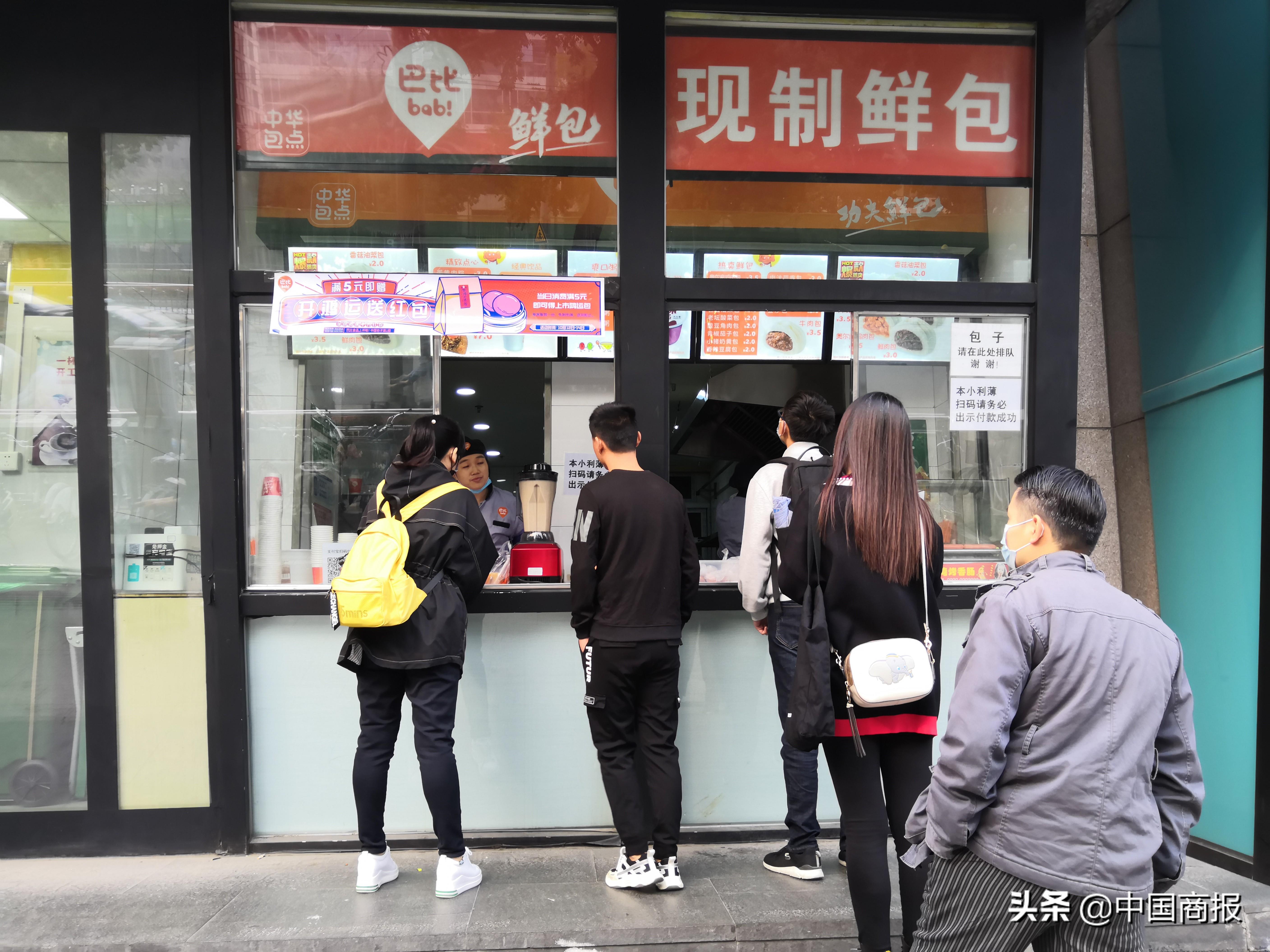 消费者在位于北京西城区的巴比食品实体店排队购买包子。