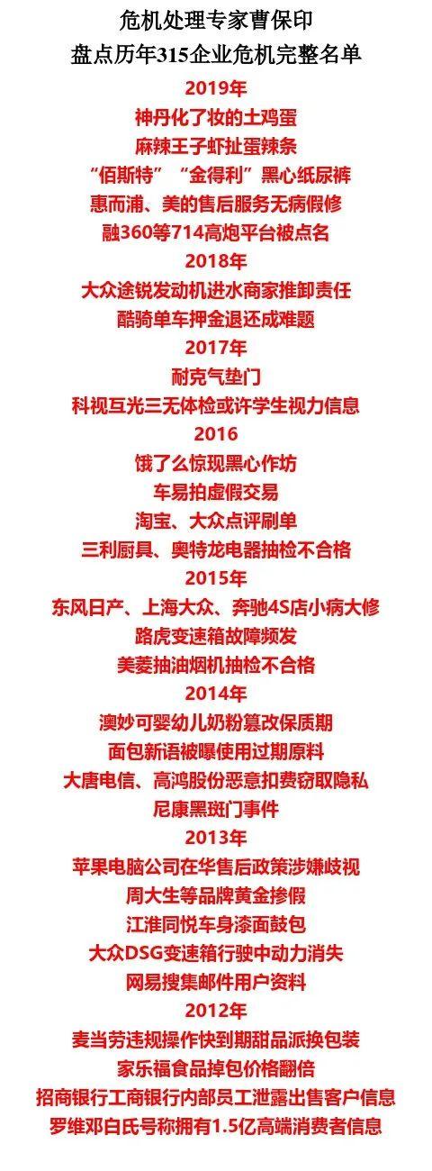 每年的315晚会,都会让很多企业及其公关公司提心吊胆,他们心惊胆战地守在电视机前,祈祷自家不要上榜。幸运的是,2020年的315晚会已确认延迟;不幸的是,延迟不是缺席,该来的总会来。2020年将会有哪些企业上榜315晚会?从2012年至2019年,在过去的8年里曾有哪些企业上榜,又分别采取了什么样的危机处理措施,取得了哪些成效?自3月15日起,著名品牌传播与危机处理专家曹保印将连续盘点历年315晚会的企业危机事件,敬请关注。同时,综合2019年公开的新闻报道,我们邀请读者一起预测哪些企业会上榜,欢迎参与。